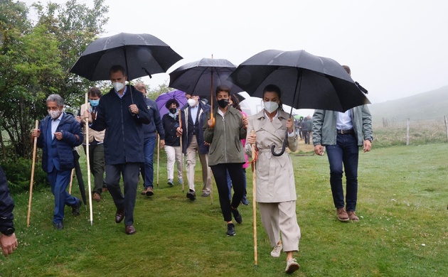 Los Reyes llegaron a la Ermita de San Salvador, en el Alto de Ibañeta, acompañados por el ministro de Agricultura, Pesca y Alimentación, Luis Planas, y fueron recibidos por la presidenta de la Comunidad Foral de Navarra, María Chivite, y por los presidentes de la Comunidades Autónomas y los alcaldes de las localidades de Roncesvalles y Valcarlos, asistentes al evento.