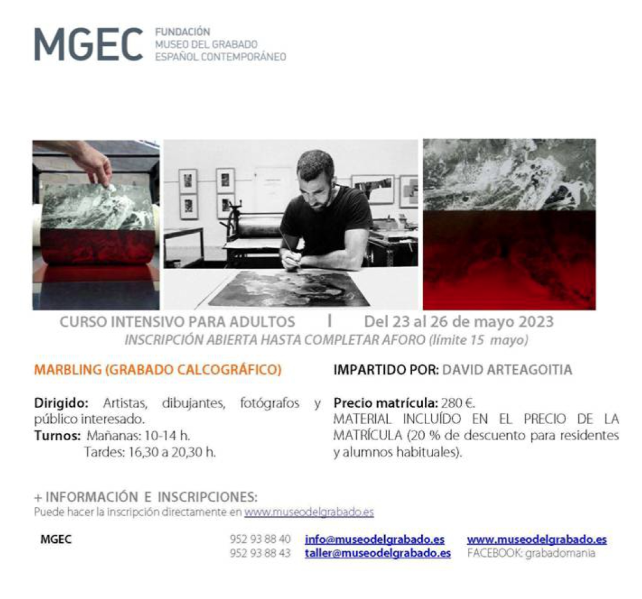 El Museo del Grabado Español Contemporáneo ha abierto el plazo de inscripción para el curso de grabado calcográfico (Marbling), que se desarrollará del 23 al 26 de mayo y que impartirá David Arteagoitia en horario de 10.00 a 14.00 horas y de 16.30 a 20.30 horas. El taller intensivo va dirigido a artistas, dibujantes, fotógrafos y público interesado, que podrán matricularse hasta el 15 de mayo o hasta que se complete el aforo. El precio es de 280 euros con el material incluido y existe un descuento del 20 por ciento para residentes y alumnos habituales. Más información y registros en la web www.museodelgrabado.es.