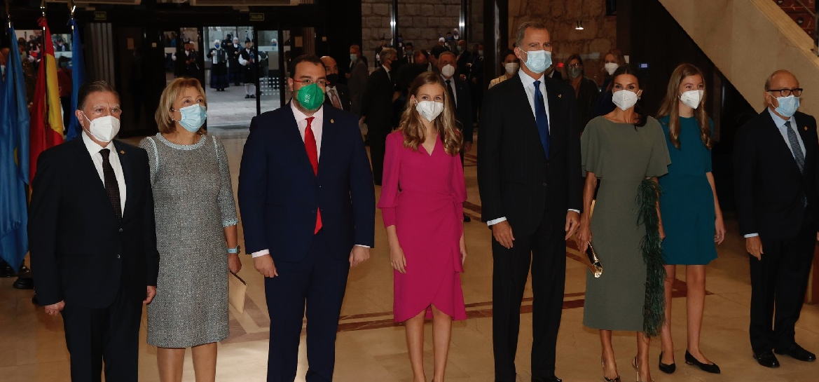 Por la tarde se celebrará en el Teatro Campoamor de Oviedo la ceremonia de entrega de los Premios Princesa de Asturias 2021, que distinguirán en esta edición a Marina Abramović, Premio Princesa de Asturias de las Artes; Gloria Steinem, Premio Princesa de Asturias de Comunicación y Humanidades; Amartya Sen, Premio Princesa de Asturias de Ciencias Sociales; Teresa Perales, Premio Princesa de Asturias de los Deportes; Emmanuel Carrère , Premio Princesa de Asturias de las Letras; CAMFED, Campaign for Female Education, Premio Princesa de Asturias de Cooperación Internacional; Katalin Karikó, Drew Weissman, Philip Felgner, Uğur Şahin, Özlem Türeci, Derrick Rossi y Sarah Gilbert, Premio Princesa de Asturias de Investigación Científica y Técnica; y a José Andrés y la ONG World Central Kitchen, Premio Princesa de Asturias de la Concordia.