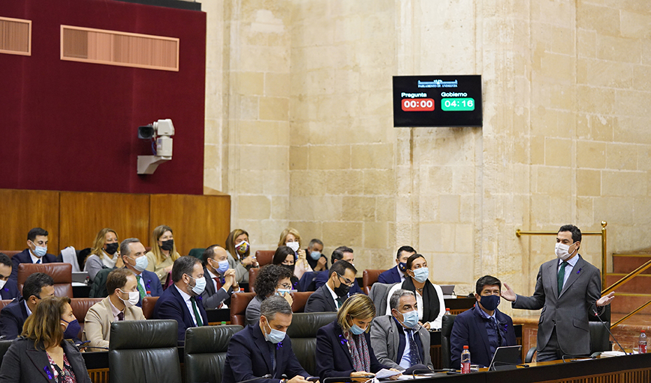 Durante su intervención en la sesión de control en el Parlamento andaluz, Moreno se ha referido al Grupo Parlamentario de Vox del que ha dicho que no tiene autonomía para tomar decisiones en la Cámara andaluza, a la vez que ha asegurado que «tomar decisiones desconociendo la realidad de Andalucía lleva a una equivocación como la que ocurrió ayer con el rechazo de los Presupuestos para 2022».