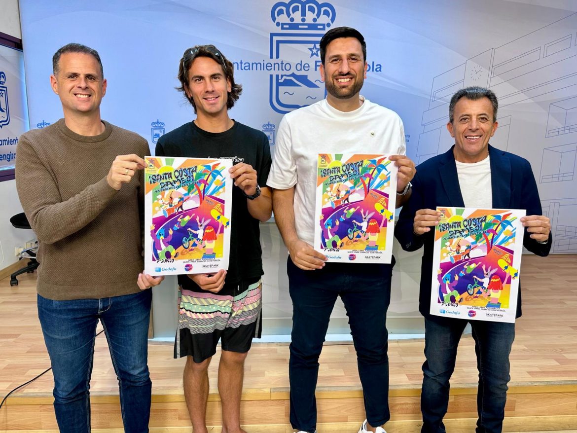 Área Libre Fuengirola, la zona de expansión, ocio y expresión artística de la ciudad, será escenario el sábado 7 de junio de la segunda edición de Santa Costa Games, que incluye competiciones de skate, BMX, baloncesto y surf skate, exhibiciones de grafitis, talleres y música, entre otras actividades. Así lo han dado a conocer esta mañana los concejales de Juventud y Deportes, Isaac Vargas y Julio Rodríguez, respectivamente, junto al organizador de esta actividad, Javier Donoso, de la empresa Dreisog, y Puskas Espada, responsable de la empresa Gedofu y de la cafetería del Skate Park, principales patrocinadores del evento.