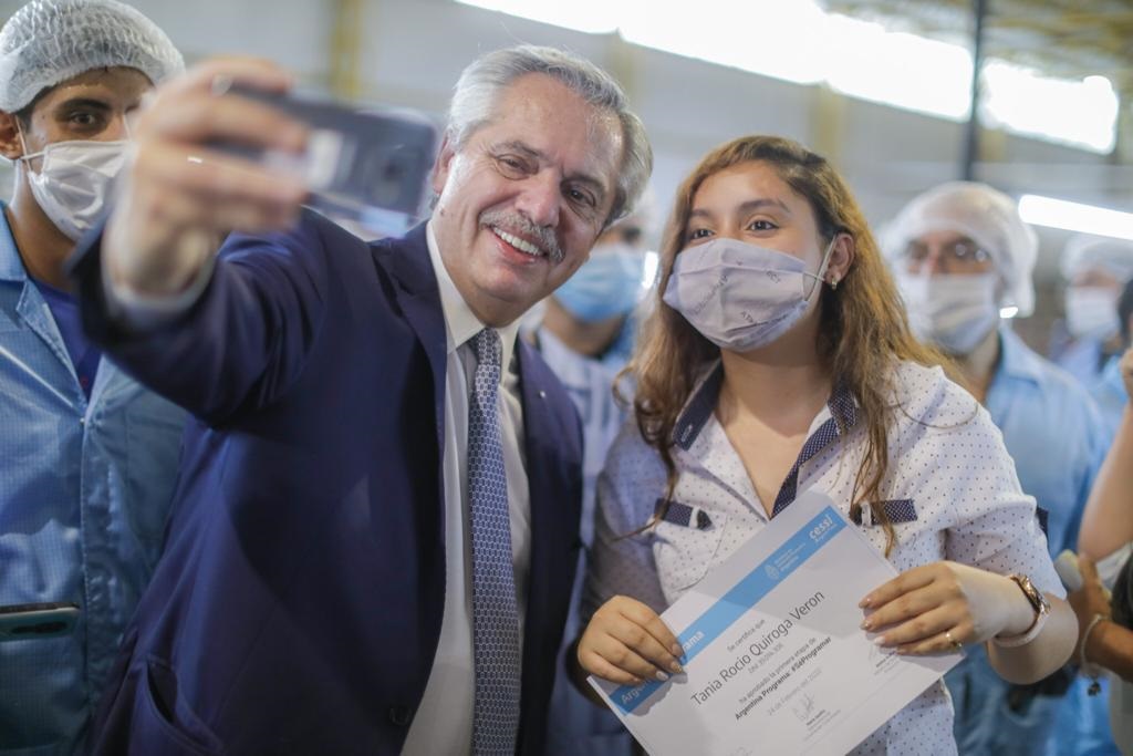 Durante el acto, además, el presidente entregó tarjetas con subsidios a alumnos y alumnas del plan Argentina Programa, que pertenece al Ministerio de Desarrollo Productivo.