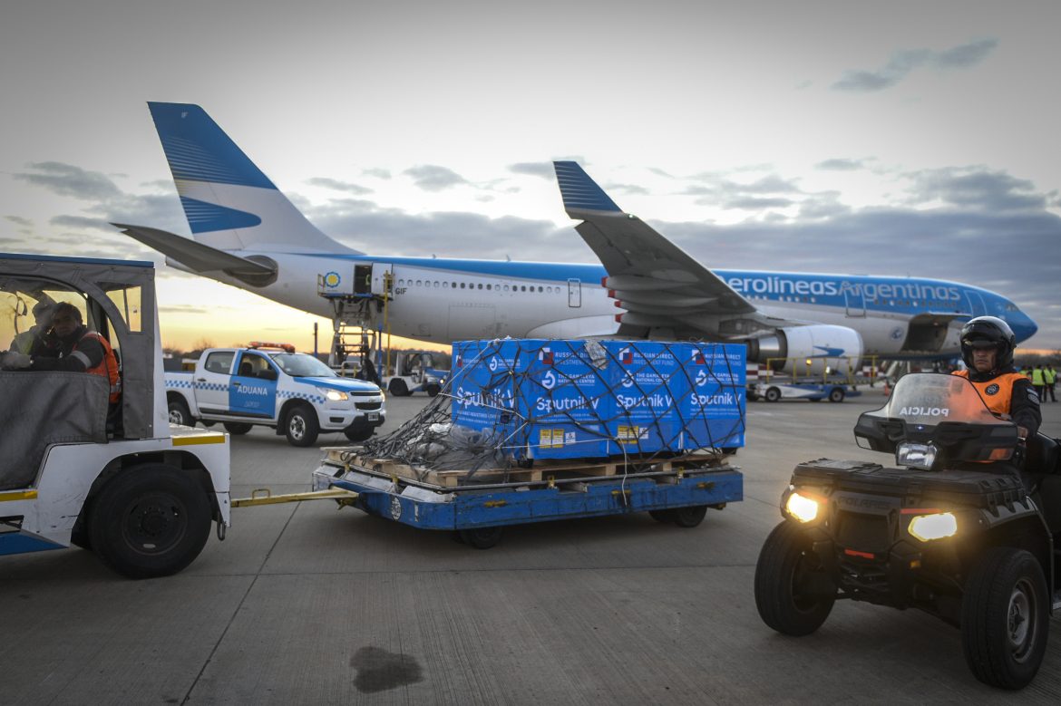 Esta tarde a las 16.56 arribó al Aeropuerto Internacional de Ezeiza el vuelo AR1063 de Aerolíneas Argentinas, proveniente de Moscú, con 400.000 dosis del componente 2 de Sputnik V, 81.850 del componente 1 y 300 litros del principio activo para comenzar la producción local de la vacuna.