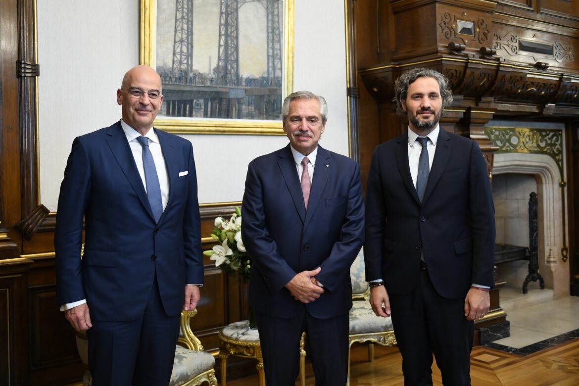 El presidente Alberto Fernández recibió hoy en Casa Rosada al ministro de Asuntos Exteriores de Grecia, Nikos Dendias, quien realiza una visita oficial a nuestro país, con quien abordó diversos temas de la agenda bilateral y multilateral referidos a áreas claves como comercio, inversiones y cooperación en educación, deportes y tecnología espacial, entre otras.