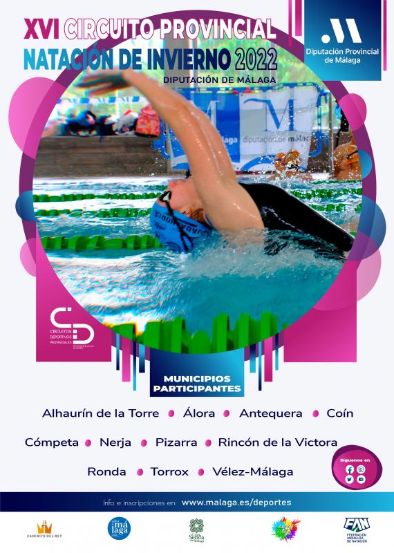 El XVI Circuito Provincial de Natación de Invierno de la Diputación de Málaga contará con la participación de once municipios de la provincia, seis más que el año pasado, volviendo así a niveles de participación pre-pandemia. Los nadadores pertenecen a Alhaurín de la Torre, Álora, Antequera, Coín, Cómpeta, Nerja, Pizarra, Rincón de la Victoria, Ronda, Torrox y Vélez-Málaga.