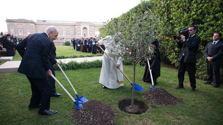 Recordó el encuentro de 2014 en el Vaticano entre el entonces presidente israelí Shimon Peres y el presidente palestino Mahmoud Abbas, señalando que no ha habido ninguno desde que los dos líderes, junto con el Papa Francisco, plantaron un olivo, representando la esperanza de paz en los Jardines del Vaticano.
