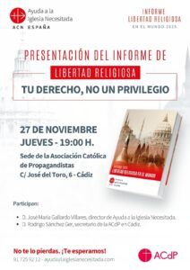 La fundación pontificia Ayuda a la Iglesia Necesitada (ACN España), en colaboración con la Asociación Católica de Propagandistas (ACdP), presenta, el jueves 27 de noviembre, su Informe Libertad Religiosa en el Mundo 2025. Será a las 19:00h en la Sede de la Asociación Católica de Propagandistas de Cádiz (c/José del Toro, 6).