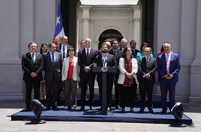 Estoy en La Moneda acompañado por los representantes de todos los Poderes del Estado: el Presidente del Senado, Álvaro Elizalde; el Presidente de la Cámara de Diputados, Vlado Mirosevic; el Presidente (s) de la Corte Suprema, Sergio Muñoz y nuestra Canciller, Antonia Urrejola. Además, nos acompañan los integrantes de las comisiones de Relaciones Exteriores tanto de la Cámara de Diputados como del Senado, a quienes agradezco su presencia. Cabe destacar que están representadas todas las fuerzas políticas de Chile.