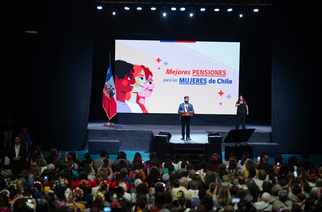 El Presidente de la República, Gabriel Boric Font, encabezó este lunes 8 de enero la actividad “Mejores Pensiones para las Mujeres de Chile”, junto a la expresidenta Michelle Bachelet; la ministra del Trabajo y Previsión Social, Jeannette Jara; la ministra Secretaría General de Gobierno, Camila Vallejo; la ministra de la Mujer y la Equidad de Género, Antonia Orellana; la ministra de Desarrollo Social y Familia, Javiera Toro; la ministra de las Culturas, las Artes y el Patrimonio, Carolina Arredondo; la ministra de Bienes Nacionales, Marcela Sandoval; la alcaldesa de Peñalolén, Carolina Leitao; además de parlamentarias; alcaldes y alcaldesas; y otras autoridades.