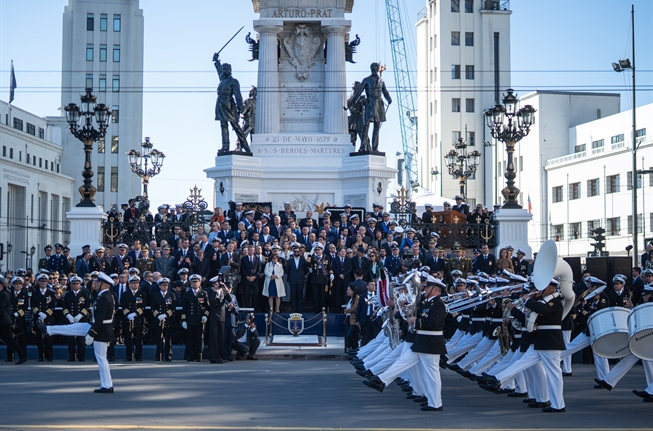 En el marco del 146° aniversario del Combate Naval de Iquique, el Mandatario junto a la ministra de Defensa Nacional, Adriana Delpiano, el Comandante en Jefe de la Armada, Juan Andrés de la Maza y otras autoridades, presenció el desfile desarrollado frente al Monumento a los Héroes de Valparaíso.