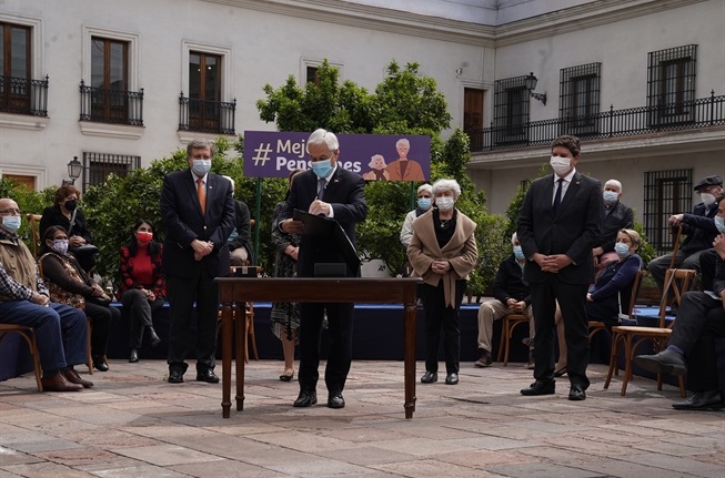 El Presidente de la República, Sebastián Piñera, firmó este lunes un proyecto de reforma de pensiones para mejorar los ingresos de los jubilados, en especial, de las mujeres y de la clase media.