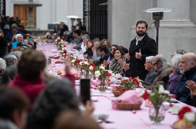 Para marcar el inicio del aumento en el pago de la PGU a 250 mil pesos para personas de 82 años o más, el Mandatario, junto a ministros y ministras de Estado y autoridades de Gobierno, compartió un desayuno con más de 300 pensionados en el Palacio de La Moneda.