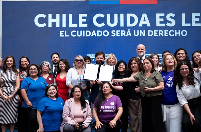 Este lunes 9 de febrero el Presidente de la República, Gabriel Boric Font, encabezó en el Palacio de La Moneda la ceremonia de promulgación que crea el Sistema Nacional de Apoyos y Cuidados, junto al ministro del Interior, Álvaro Elizalde; las ministras de Desarrollo Social y Familia, Javiera Toro; de la Mujer y la Equidad de Género, Antonia Orellana; de la Secretaría General de Gobierno, Camila Vallejo; de la Secretaría General de la Presidencia, Macarena Lobos; de Salud, Ximena Aguilera y el ministro (s) del Trabajo y Previsión Social, Claudio Reyes