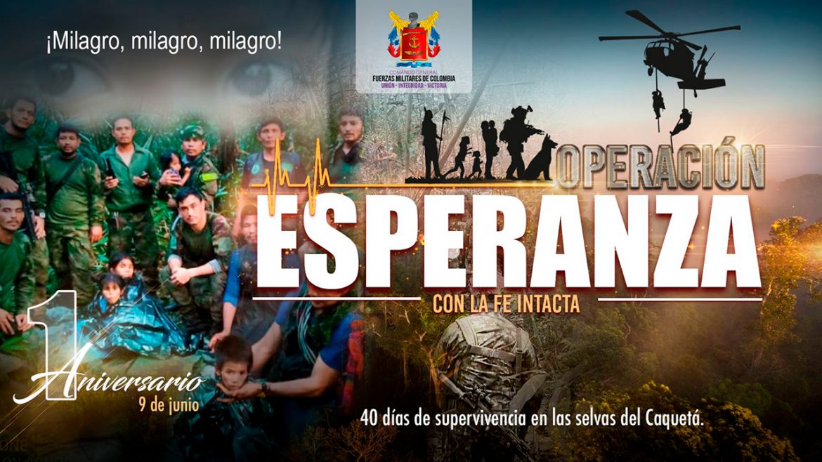 Con una ceremonia religiosa, un encuentro familiar y un almuerzo en las instalaciones de la Escuela de Caballería, en el norte de Bogotá, se conmemoró el primer aniversario de la mítica ‘Operación Esperanza’, que permitió a un grupo especializado de las Fuerzas Militares rescatar sanos y salvos a los cuatro niños indígenas que sobrevivieron 40 días en la selvas entre los departamentos de Guaviare y Caquetá, tras el accidente de la avioneta en que se transportaban.