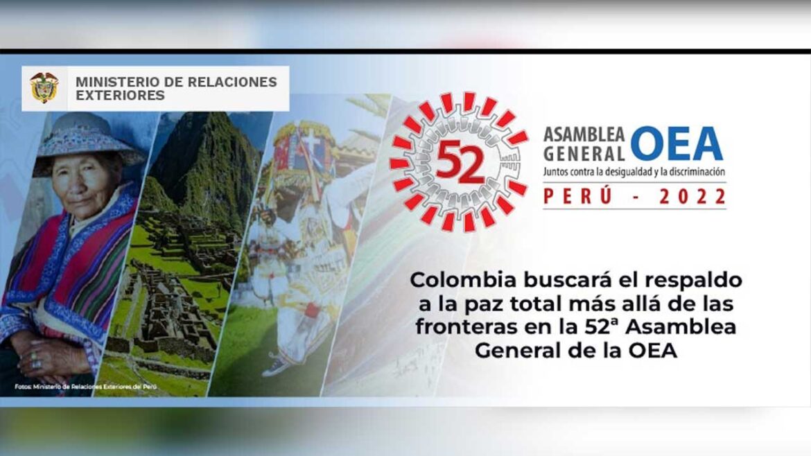 Esta semana, el Ministro de Relaciones Exteriores y Paz, Álvaro Leyva Durán, y la Viceministra de Asuntos Multilaterales, Laura Gil, participarán, en Lima, en el 52º Periodo Ordinario de Sesiones de la Asamblea General de la Organización de los Estados Americanos (OEA). Conseguir el apoyo por parte de los países miembros a la Paz Total en Colombia será el principal objetivo de la delegación.