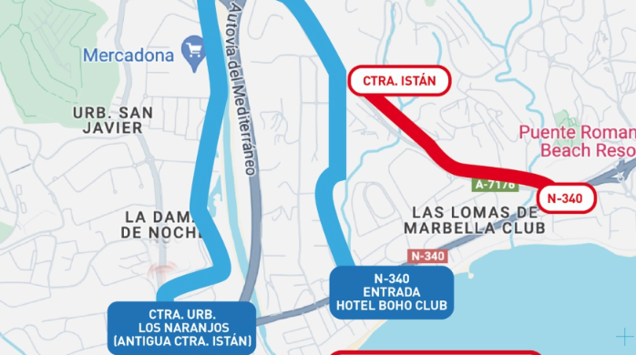 El Ayuntamiento informa de que, con motivo de las obras de acondicionamiento y urbanización de la carretera A-7176 entre Marbella e Istán que está acometiendo la Junta de Andalucía, a partir de hoy lunes, 1 de abril, se procederá al corte del tráfico por un periodo de tres meses en el tramo de la citada vía comprendido entre la antigua nacional 340 y el punto kilométrico 1. Durante este periodo, los vehículos podrán utilizar como alternativas de circulación la salida 1048 de la autovía A-7, la carretera de la Urbanización Los Naranjos y, desde la antigua carretera 340, el vial que discurre a la altura del hotel Boho Club.