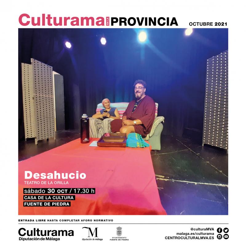 El municipio de Fuente de Piedra (Casa de la Cultura) acoge la obra ‘Desahucio’ de Teatro de la Orilla el 30 de octubre, a las 17.30 horas. Los espectadores conocerán a sus protagonistas, Bruno y Lola, una pareja que reside en Madrid en un piso de alquiler con muchos sueños y poco dinero. Son Artistas y esto implica una forma especial de relacionarse con el mundo exterior y entre ellos.