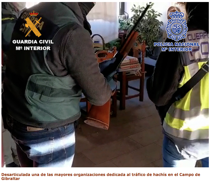 Agentes de la Guardia Civil y de la Policía Nacional han desarticulado una de las principales organizaciones de tráfico de hachís que operaba en el Campo de Gibraltar. La investigación ha finalizado con 21 personas detenidas y 16 registros domiciliarios en Algeciras (Cádiz), Los Barrios (Cádiz) y Estepona (Málaga). Asimismo, se han recuperado 4 vehículos sustraídos, 40.000 cajetillas de tabaco de contrabando, 1.000 litros de gasolina, un dron con cámara térmica y más de 18.000 euros. La organización introducía en nuestras costas grandes cantidades de hachís, procedente de Marruecos, mediante “narcolanchas”; posteriormente lo transportaban en vehículos de alta gama hasta lugares seguros o “guarderías” para, finalmente, distribuirla por todo el territorio nacional hacia otros países europeos.