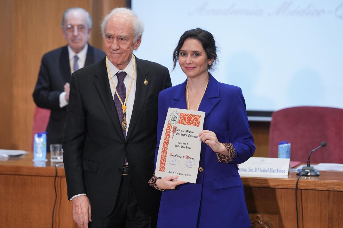 La jefa del Ejecutivo autonómico ha sido distinguida como Académica de Honor de la Academia Médico- Quirúrgica Española, en un acto celebrado en la Facultad de Medicina de la Universidad Complutense de Madrid. “Este reconocimiento también le pertenece a la sociedad madrileña, comprometida, solidaria, que da todo lo que tiene, no mide el origen y solo quiere saber cómo crecer juntos”, ha enfatizado, para resaltar que precisamente por eso es “única en el mundo, admirada, querida y, sobre todo, añorada cuando uno sale fuera “.