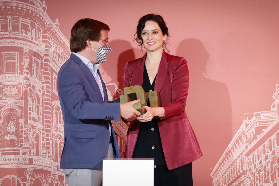 La presidenta en funciones de la Comunidad de Madrid, Isabel Díaz Ayuso, ha recibido Premio a la Mujer del Año, de manos del alcalde de Madrid, José Luis Martínez-Almeida, en el transcurso de la Gala de los Premios Madrid, organizada por Madrid Diario. La jefa del Ejecutivo madrileño ha agradecido la concesión de este galardón y ha manifestado que la región “tiene un futuro prometedor donde nos hemos convertido en un lugar de referencia por el que todo el mundo pregunta y del que todo el mundo quiere saber”.