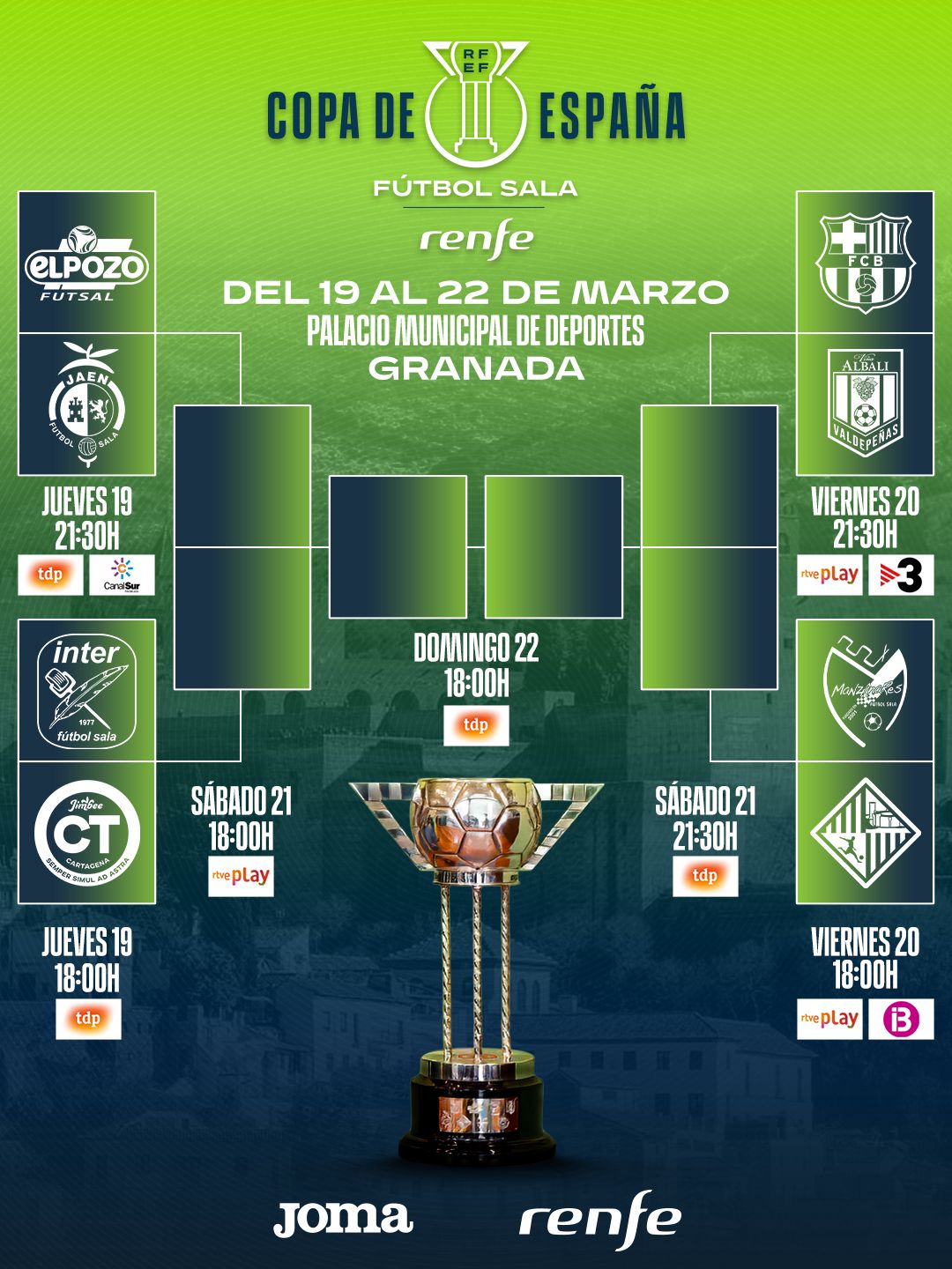 Del 19 al 22 de marzo, Granada se convertirá en el epicentro del fútbol sala nacional. Allí, ElPozo Murcia Costa Cálida, Barça, Movistar Inter, Jimbee Cartagena Costa Cálida, Quesos El Hidalgo Manzanares, Jaén Paraíso Interior, Viña Albali Valdepeñas e Illes Balears Palma Futsal, lucharán por el título.