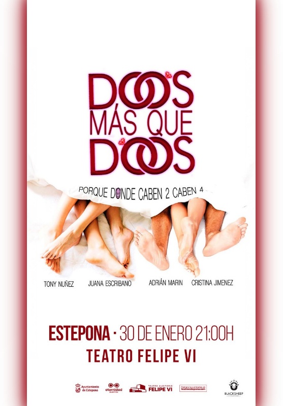 El Ayuntamiento de Estepona informa que el escenario del Teatro Auditorio Felipe VI acogerá el próximo viernes 30 de enero, a las 21:00 horas, la representación teatral de la obra ‘Dos más que dos’, una comedia desternillante sobre dos parejas y sus secretos más ocultos, donde comprobaremos que donde caben dos…caben cuatro.