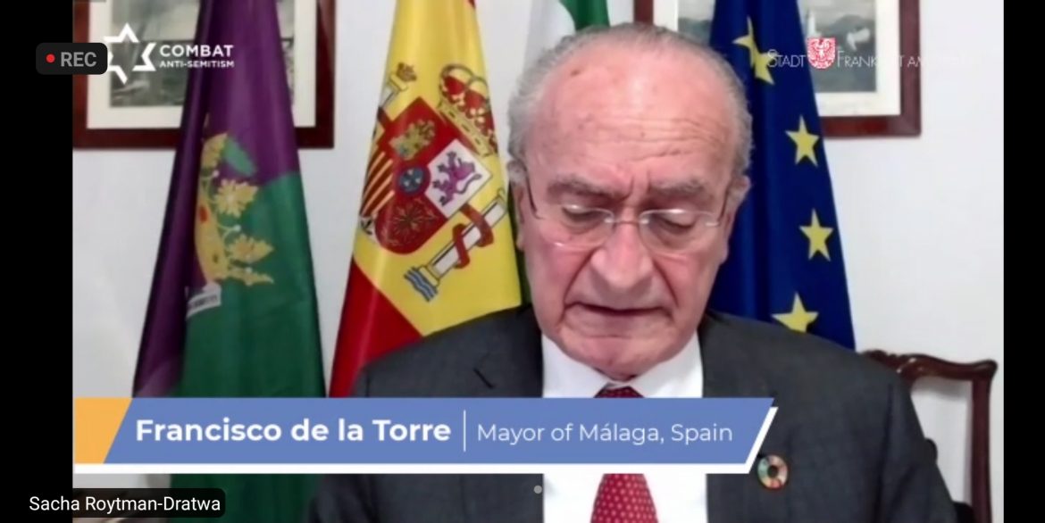 El Alcalde de Málaga, Francisco de la Torre, ha intervenido en la Cumbre de Alcaldes contra el Antisemitismo, una conferencia internacional de municipios que se quieren comprometer para luchar contra el antisemitismo y trabajar juntos para promulgar propuestas políticas y encontrar acciones para combatir eficazmente las diversas manifestaciones del antisemitismo contemporáneo. Con el alcalde de Frankfurt, Uwe Becker, como anfitrión, la conferencia cuenta con la presencia de los regidores de Pisttsburg, Bruselas, Atenas, Paris, Toronto, Palermo, Tirana, Buenos Aires o Manchester, además de la vicepresidenta de Valores y Transparencia de la Comisión Europea, Vera Jourova. De la Torre ha destacado en su intervención, como único representante español en esta cumbre, que Europa y América deben mirar a la cara del fantasma del antisemismo, un problema que afecta principalmente a las comunidades locales. El Alcalde ha explicado que la comunidad judía en la ciudad la integran unas 1.500 personas, que viven en un municipio donde es una seña de su identidad la convivencia respetuosa entre los diferentes y la lucha contra los delitos de odio. También ha recordado que la ciudad cuenta con un Foro de Pluralismo Religioso, que se ha dedicado una plaza a Violeta Friedman, superviviente de Auschwitz, y que en 2021 se conmemora el milenario del nacimiento del poeta, rabino, filósofo y escritor Salomón Ibn Gabirol. Esta conferencia internacional pone el acento en que los líderes locales y municipales pueden tener un impacto importante en la lucha contra el antisemitismo, ya que son ellos los que se ocupan de los retos cotidianos de la comunidad. Además, tienen la capacidad de involucrar a la ciudadanía a través de las normas, la educación y los proyectos de cohesión comunitaria. De este modo, se podrán consolidar municipios más inclusivos para toda su ciudadanía. La cumbre persigue iniciar el diálogo global entre los líderes locales para combatir el antisemitismo a nivel local, compartir prácticas experimentadas en actos antisemitas, crear grupos de trabajo y poner en común herramientas que puedan utilizarse para proteger a las comunidades judías.