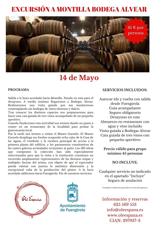 El Área de Tercera Edad del Ayuntamiento de Fuengirola ha organizado para el 14 de mayo un viaje a Montilla que incluye una visita a las Bodegas Alvear. Así lo ha dado a conocer la concejala de Familias, Igualdad y Bienestar Social, Cristina Bornao, quien ha explicado que el precio de esta actividad será de 61 euros que incluye viaje en autocar, guía acompañante, desayuno en ruta, almuerzo, visita guiada a la bodega, cata de vinos y aperitivo y seguro de viaje.