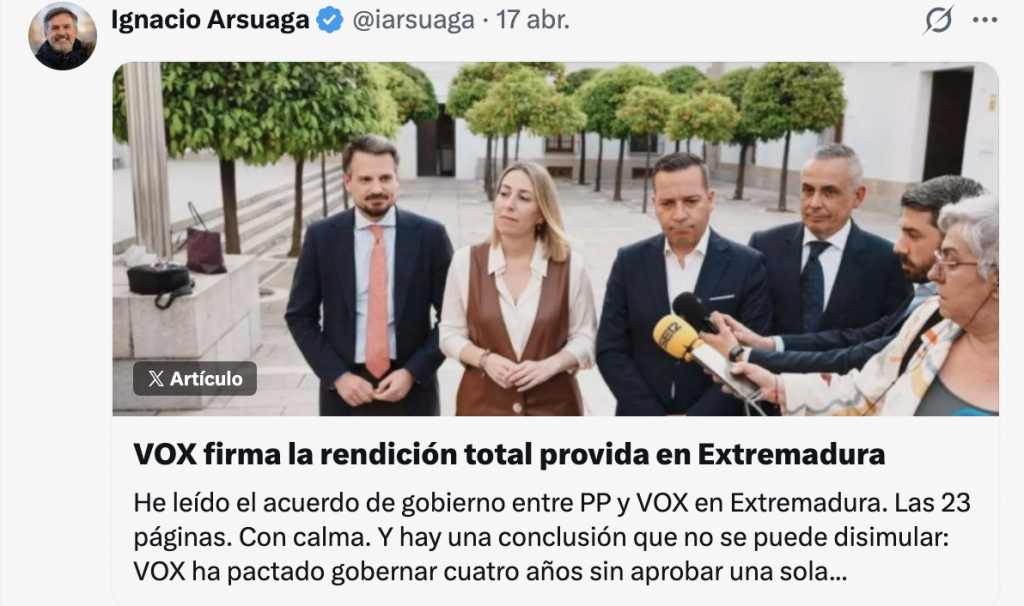 Una de las más claras conclusiones que se ha podido sacar del acuerdo de PP-Vox en Extremadura es la máxima prioridad del PP a nivel nacional en no renunciar a adoctrinar a los niños en el nacionalismo contra España como medio de defensa de las autonomías, que en Andalucía es el nacionalismo islámico de Blas Infante, mientras les privan de la historia de la Nación más grande de la historia que es España y de la que niños y jóvenes podrían aprender y promover para ver el futuro con más optimismo.