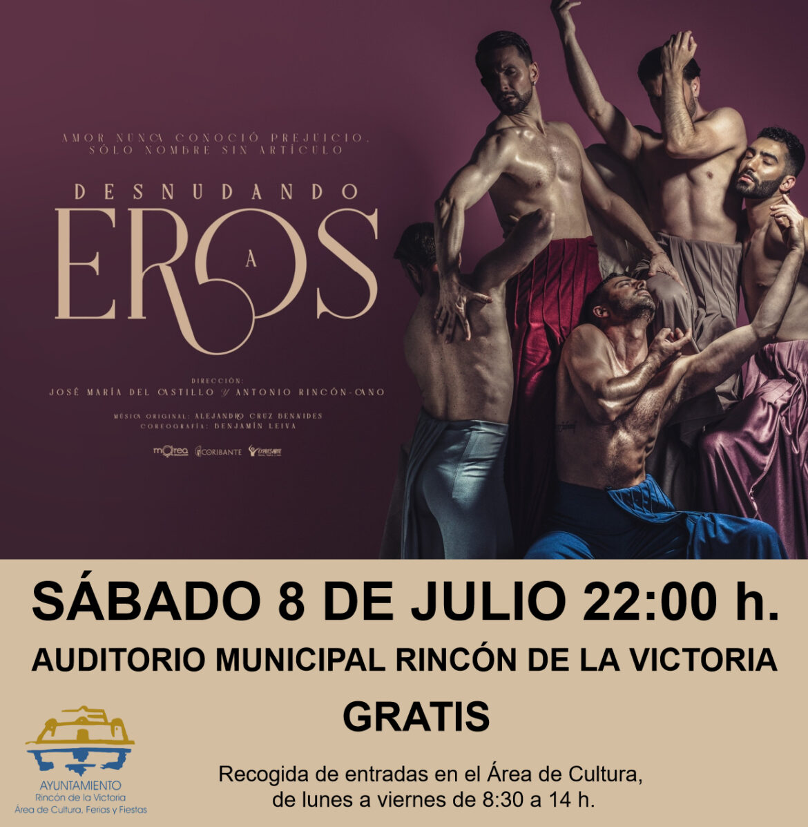 La Concejalía de Cultura presenta las obras de las compañías internacionales Coribante con `Desnudando a Eros´, y de Diego Valdivia, los días 8 y 9 de julio a las 22:00 horas Finalmente, ambos espectáculos serán gratuitos hasta completar aforo.