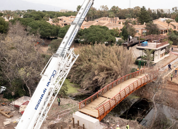 El Ayuntamiento de Estepona informa que ayer se instaló el puente de madera sobre el Arroyo Dos Hermanas para seguir avanzando en el proyecto de corredor litoral.
