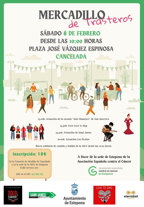 El Ayuntamiento de Estepona informa que, el próximo 8 de febrero, Cancelada celebrará el primer Mercadillo de Trasteros solidario de este año a beneficio de la Asociación Española contra el Cáncer (AECC). Esta actividad se hará con motivo de la celebración del Día Mundial contra el Cáncer, que es una jornada conmemorativa que se celebra anualmente el 4 de febrero desde el año 2000, establecido por la UNESCO para promover la investigación y prevención del cáncer, mejorar la atención a pacientes, incrementar la concienciación y movilizar a la comunidad global en la lucha contra esta enfermedad.