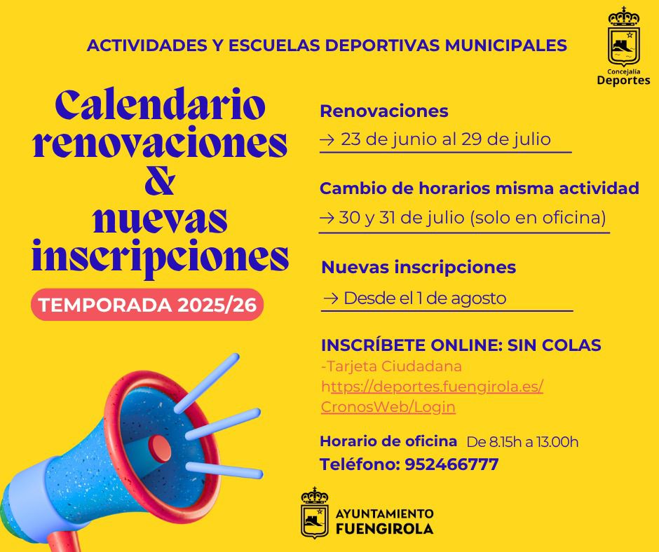 El Ayuntamiento de Fuengirola abrirá el próximo lunes 23 de junio el plazo de renovación de plazas tanto paras las actividades dirigidas para adultos como para las diferentes escuelas deportivas municipales. Así lo ha anunciado esta mañana el concejal de Deportes, Julio Rodríguez, quien ha señalado que un total de 4.389 usuarios podrán reinscribirse en las clases que han tomado durante este curso deportivo en la web de deportes, en la app Tarjeta Ciudadana, o de forma presencial, hasta el 29 de julio. Además, los días 30 y 31 de julio se podrán realizar cambios de horario dentro de la misma actividad y a partir del 1 de agosto se abrirá el plazo para las nuevas inscripciones.