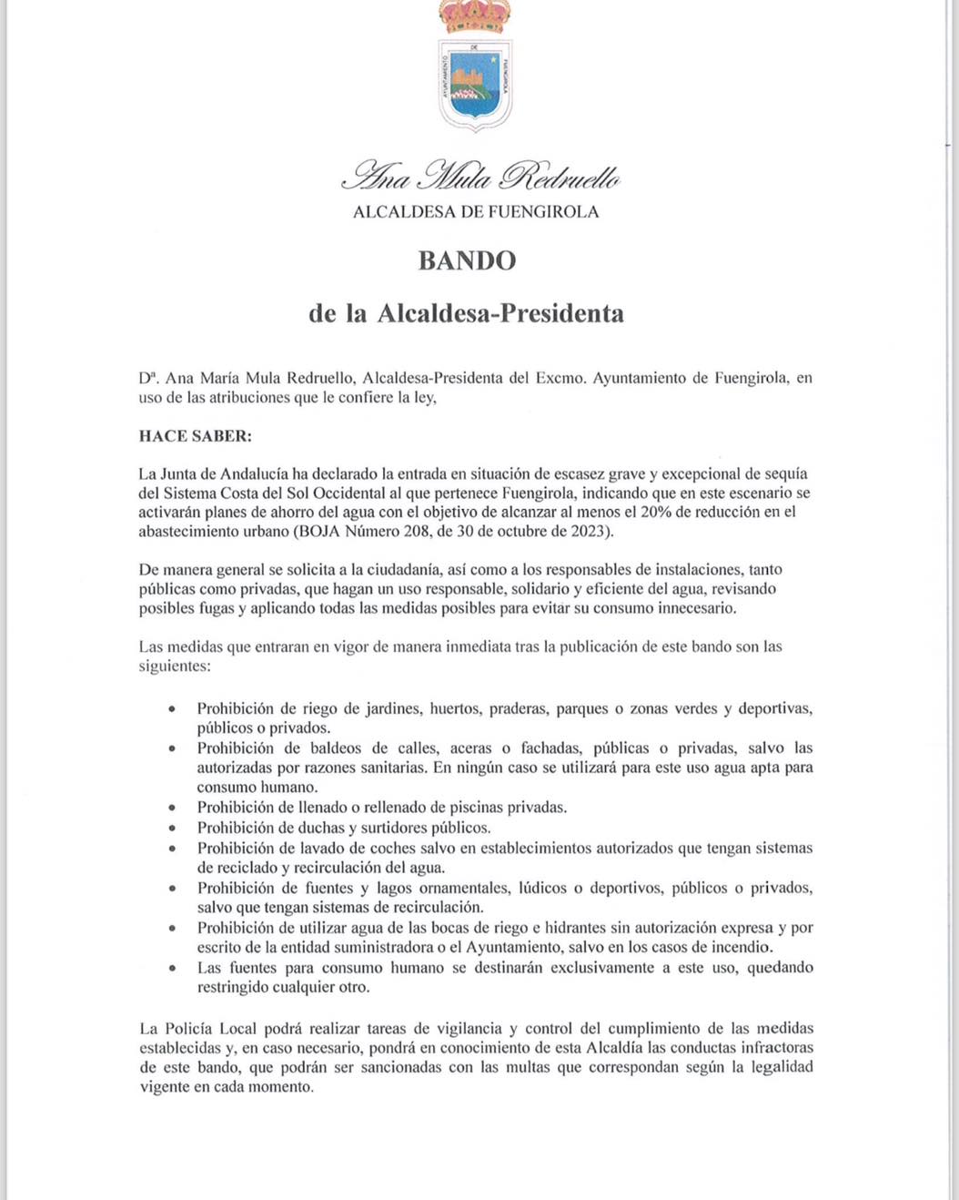 “La Junta de Andalucía ha declarado la entrada en situación de escasez grave y excepcional de sequía. Por tanto, desde el Ayuntamiento de Fuengirola, el pasado viernes, se publicó un Bando en que se recogían las prohibiciones a las que ese decreto hace referencia, con el objetivo de alcanzar, al menos, el 20% de reducción en el abastecimiento de agua urbana”, ha explicado Díaz.