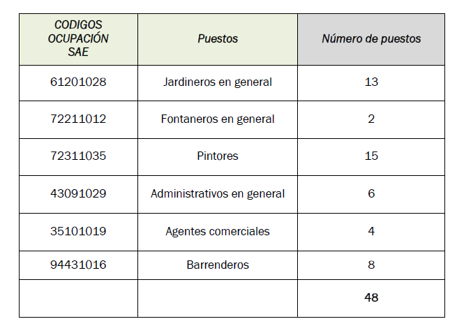 Los perfiles escogidos son: trece jardineros, dos fontaneros, quince pintores, seis administrativos, cuatro agentes comerciales que se dedicarán a recoger información del tejido comercial local para propiciar campañas de apoyo al mismo, así como ocho barrenderos.