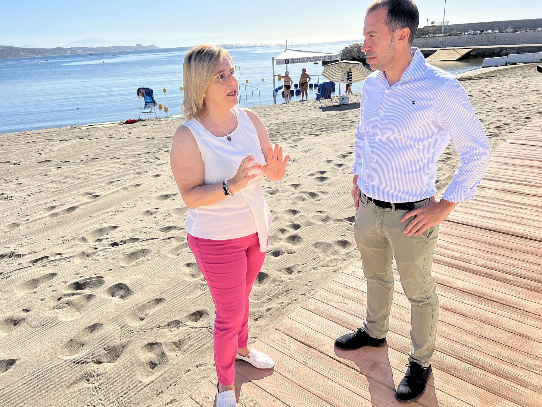 Así, según ha detallado Mula, esta plataforma, que estará instalada hasta el 30 de septiembre, “se divide en tres espacios: un área que cuenta con 22 asientos semi-sumergidos en el agua, para que quienes los utilicen se puedan sentar y refrescarse. Otra zona de balizamiento, donde se forman unas calles para que los mayores puedan nadar con seguridad y, si se cansan o advierten algún tipo de peligro, puedan agarrarse a unos cabos que hay entre las boyas y así sentirse totalmente seguros. La tercera zona está compuesta por unas barandillas unidas al suelo, que van prácticamente desde la orilla hasta adentrarse en el agua, para que las personas puedan entrar y salir cómodamente y con la mayor facilidad”.