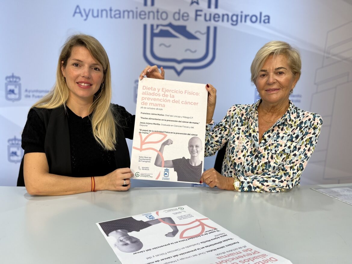 El Ayuntamiento de Fuengirola y la Asociación Española Contra el Cáncer (AECC) ofrecerán una conferencia sobre prevención del cáncer de mama a través de la alimentación y el ejercicio físico. Así lo han dado a conocer esta mañana la concejala de Bienestar Social y Familias, responsable del Área de Igualdad, Rocío Rodríguez, y la presidenta de AECC Fuengirola y Mijas, Paula Casas, quienes han señalado que la cita será el día 26 de octubre, a partir de las 18:00 horas, en el Salón Real del Consistorio fuengiroleño, donde Francisco Jaime, chef del Unicaja y Málaga CF, y Jesús Arjona, graduado en Ciencias Físicas y del Deporte, ofrecerán la ponencia titulada ‘Dieta y ejercicio físico: aliados de la prevención del cáncer de mama’.