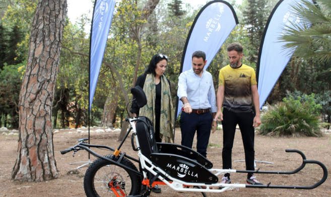 El Ayuntamiento ha adquirido la primera silla adaptada ‘Joëlette’ que permitirá a niños y adultos con movilidad reducida participar en eventos deportivos por montaña. El concejal del ramo, Lisandro Vieytes, ha presentado hoy la iniciativa junto al director técnico y la tesorera del club Ultra Trail Sierra Blanca, José Ramón Pacheco y Marina Robertson, respectivamente, y ha señalado que “estamos apostando firmemente por la accesibilidad y, gracias a la incorporación de este nuevo elemento, que lucirá el nombre de Marca Marbella, todas las competiciones que transcurran por terrenos de mayor dificultad podrán contar con una categoría inclusiva”. Asimismo, ha resaltado que “era un compromiso que teníamos con diferentes colectivos y estamos muy satisfechos porque se ha podido materializar”.