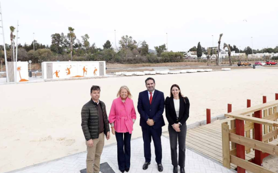 La regidora ha detallado que “para acometer este recinto se ha depositado un total de 2.900 metros cúbicos de arena especial de sílice que ha se traído desde la localidad gaditana de San José del Valle, con un gran lavado y sin polvo de entre 0,5 y 1 milímetro, tal y como demandan las distintas federaciones españolas, y además las canchas pueden acomodarse a las dimensiones que marca la FIFA”. Asimismo, ha especificado que el parque, que está conectado con el Paseo Marítimo, dispondrá de senderos, un auditorio y una bolsa de aparcamiento con más de 260 plazas y ha indicado que “estaba prevista la plantación de una serie de especies arbóreas, pero se ha visto retrasada por las restricciones de riego actuales”.