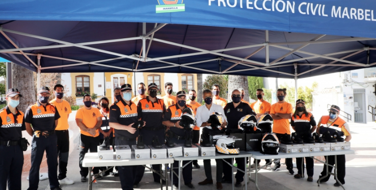 El concejal de Seguridad Ciudadana, José Eduardo Díaz, ha hecho entrega esta tarde, en la Plaza de la Iglesia de San Pedro Alcántara, de nuevo material para reforzar la labor de Protección Civil, cuya agrupación en la ciudad alcanza el centenar de voluntarios, al que se sumarán una nueva furgoneta prevista para este ejercicio, para el transporte de personal en intervenciones que requieran del traslado de un gran número de voluntarios en un único viaje, así como nuevas motos acuáticas. El edil ha señalado que el material cuenta con una inversión de cerca de 12.000 euros y ha concretado que “incluye una carpa, que servirá como puesto de mando avanzado, nuevos cascos para las diferentes unidades motorizadas, entre quads, carretera y scooters, y calzado muy demandado y muy versátil debido a las actuaciones que realizan a pie de calle, playa o montaña”.
