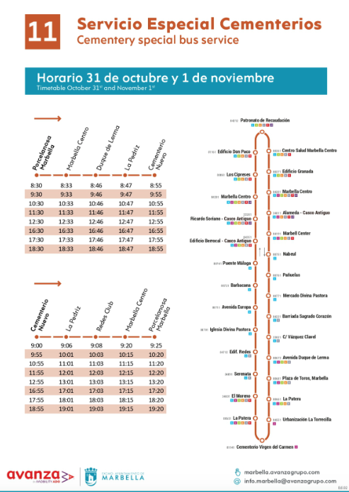 El Ayuntamiento ha habilitado para los días 31 de octubre y 1 de noviembre, coincidiendo con la Festividad de Todos los Santos, un servicio extraordinario de transporte urbano, a través de la Línea 11, entre las paradas de Porcelanosa (avenida Ricardo Soriano) y el cementerio nuevo de Marbella, con un horario que se iniciará a las 08.30 horas y tendrá su última salida a las 18.55 horas desde el camposanto. En el caso de San Pedro Alcántara, será la línea 7 la que acerque a los vecinos a las instalaciones en el horario habitual de los días laborables.