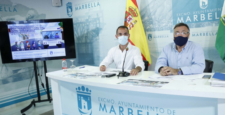 El Ayuntamiento de Marbella abrirá del 2 al 31 de agosto el plazo de solicitud para el transporte escolar y universitario de cara al curso 2021/22. El concejal y el asesor del ramo, Enrique Rodríguez y Baldomero León, respectivamente, han presentado hoy la convocatoria y las novedades para al año académico que se iniciará en septiembre y que posibilitará que la inscripción se realice tanto de forma presencial, en cualquier registro del Consistorio, o telemáticamente. El edil ha señalado que “se trata de un servicio que no presta ninguna otra administración andaluza de las mismas características que la nuestra” y ha destacado la labor de la plantilla municipal “en un etapa tan compleja por la incidencia de la pandemia del Covid-19, que ha posibilitado que se superara sin ningún brote”.