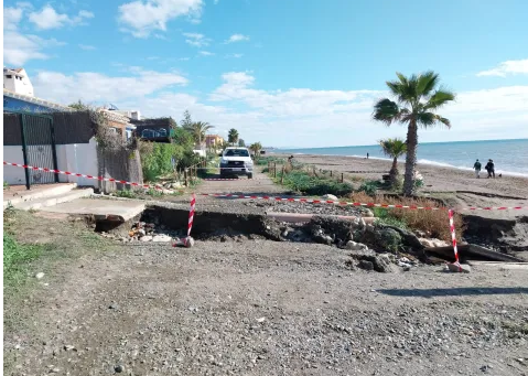 Los fenómenos meteorológicos adversos provocaron importantes daños a lo largo de todo el litoral del municipio. Entre las afecciones registradas se encuentran escorrentías que deterioraron el itinerario peatonal de la senda litoral, aterramientos en desembocaduras de arroyos, descalce de elementos de contención e infraestructuras públicas, así como daños en equipamientos de playa y en la barandilla de protección situada junto a la hornacina de la Virgen del Carmen.