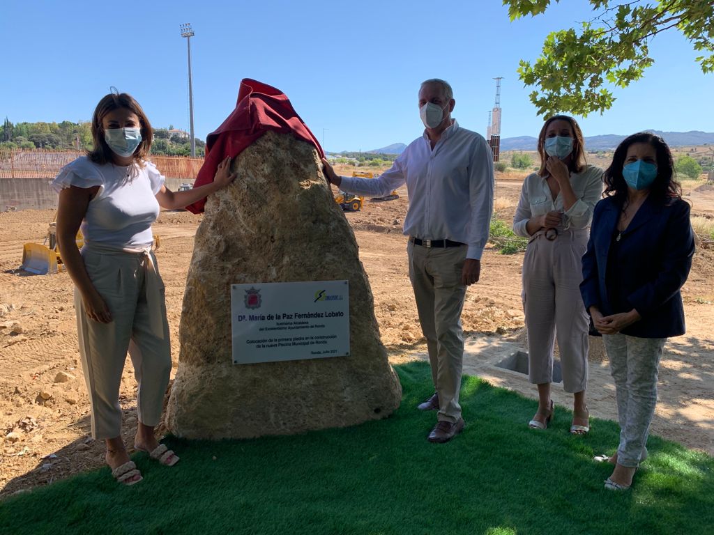 El Ayuntamiento de Ronda ha colocado la primera piedra de las obras de la nueva piscina municipal que ya han comenzado en unos terrenos situados a la entrada de la ciudad junto a la barriada de la Cruz de San Jorge y al lado de la ciudad deportiva. La alcaldesa, Mª Paz Fernández, junto a la segunda teniente de alcalde, Josefa Valle, la delegada de Obras, Concha Muñoz, el concejal de Deportes, Carlos Mirasol, el responsable municipal de Turismo, Ángel Martínez, técnicos municipales y responsables de la empresa encargada de los trabajos, han procedido a situar una cápsula del tiempo con elementos como monedas de curso legales o los periódicos del día junto a un monolito que recuerda la colocación de la simbólica primera piedra.