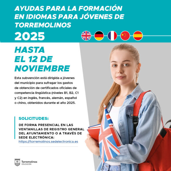 El Ayuntamiento de Torremolinos, a través de la delegación de Educación, abre a partir de mañana el plazo de solicitud de ayudas económicas destinadas a jóvenes del municipio que hayan obtenido durante 2025 una acreditación oficial de competencia lingüística en los niveles B1, B2, C1 o C2 en los idiomas de inglés, francés, alemán, español o chino.
