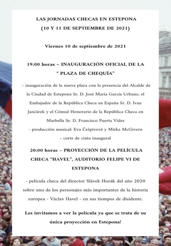 El Ayuntamiento de Estepona y la Embajada de la República Checa en España han organizado unas jornadas de actividades en la ciudad, que se desarrollarán el 10 y 11 de septiembre. Los actos comenzarán el día 10 con la inauguración de la Plaza de Chequia, que contará con la presencia del alcalde de Estepona, José María García Urbano, y el embajador de la República Checa en España, Ivan Jancárek, entre otras personalidades.