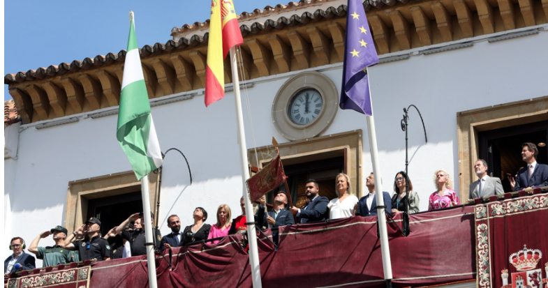 El balcón del Ayuntamiento luce hoy el Pendón de la ciudad, en la jornada previa al Día Grande de Marbella, que tendrá lugar mañana, 11 de junio, con la solemne misa y procesión del Santo Patrón San Bernabé por las calles del centro. El acto de colocación de la reliquia histórica, por parte del concejal más joven de la Corporación, Alejandro González, ha contado también con la izada de banderas y ha estado amenizado por la Banda Municipal de Música, que ha acompañado además al pasacalles de gigantes y cabezudos por el Casco Antiguo.