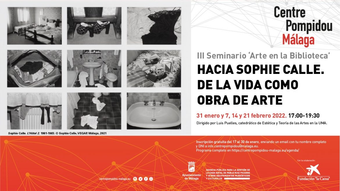 El III seminario Arte en la biblioteca. Hacia Sophie Calle. De la vida como obra de arte dará comienzo a partir del lunes, 31 de enero, en el auditorio del Centre Pompidou Málaga. El catedrático de Estética y Teoría de las Artes de la UMA, Luis Puelles, dirige e imparte el ciclo formativo que en esta edición se centra en la artista de referencia en el panorama francés e internacional y que actualmente es la protagonista de la exposición temporal de este espacio. El seminario está dividido en 4 sesiones, que se desarrollarán una vez a la semana hasta el 21 de febrero. La entrada es gratuita, previa inscripción en el email info.centrepompidou@malaga.eu para solicitar certificado de asistencia y libre hasta completar aforo para asistir como oyente.