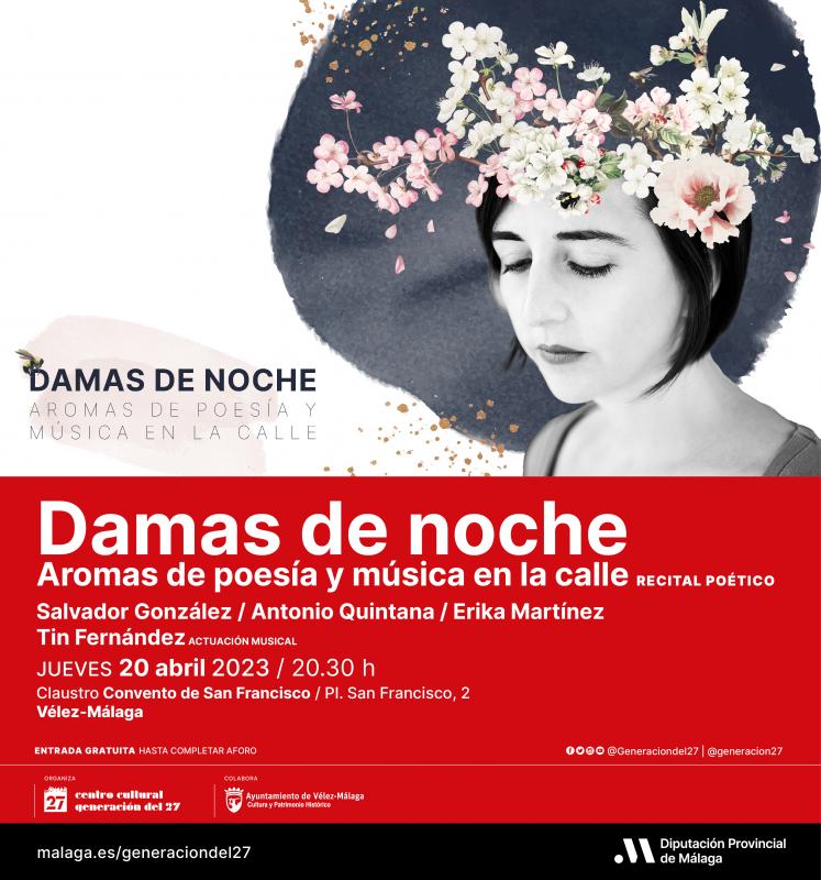 Este jueves, 20 de abril, se celebrará en Vélez-Málaga una nueva cita del ciclo ‘Damas de noche: aromas de poesía y música en la calle’, con los poetas Erika Martínez, Salvador González y Antonio Quintana, acompañados por la música de Tin Fernández