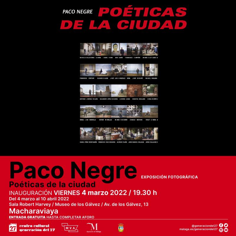 A través del compromiso del Centro Generación del 27 con las artes plásticas, llega a Macharaviaya una nueva exposición fotográfica, ‘Poéticas de la ciudad’, de Paco Negre. La muestra, tras pasar por el Centro Cultural María Victoria Atencia, realizará un recorrido itinerante por distintos municipios de la provincia. La inauguración de exposición será el próximo viernes, 4 de marzo, a las 19.30 horas, en la sala Robert Harvey. Museo de los Gálvez (Av. de los Gálvez, 13). La colección permanecerá expuesta hasta el domingo 10 de abril y la entrada será gratuita con cumplimiento de las medidas de seguridad derivadas de la covid-19.